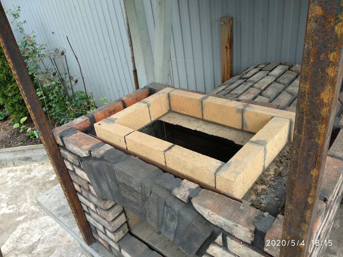 Заднюю стенку доделал, она будет служить опорой для стального листа. Спереди лист будет опираться на дугообразный разделитель который я вырезал из жаростойкой плиты.утеплитель уложил, стальной лист, который будет служить опалубкой закрепил на анкеры в плиту через уголок. Теперь надо решать ребус - как совместить круглое с квадратным - надо ли перевязывать и как лицевой кирпич арки с лицевым кирпичом шестка (прямоугольной кладки)