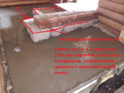 | не надо так женщин пугать, фундамент свайный, сверху плита, она воспринимает и распределяет нагрузки. Треснет плита тогда и печь, а если всё армировано то до ядерной войны простоит. Яб накидал пару пачек кирпича на плиту и выставил маяки. А жп втыкать в такую баню -последнее дело |