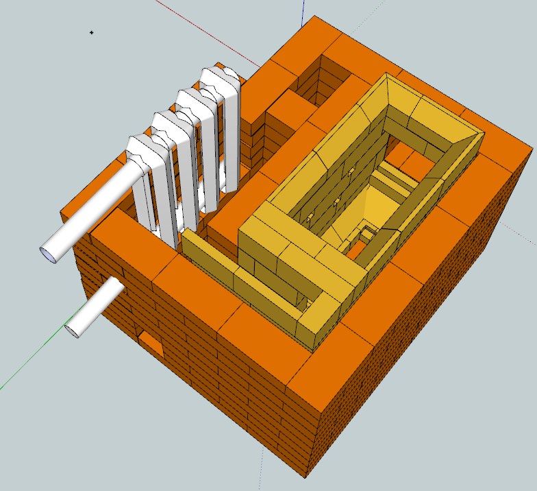 В этой печи верхний зимний горизонтальный канал аккуратненько попадает через задвижку в трубу. Резкий поворот на 90 град. вверх в трубу через задвижку меня смущает...В этом месте к тому же сходятся в одну точку зимний и летний каналы. А там еще металлическая труба из подвала. Она задумана (не мной) для улучшения тяги.