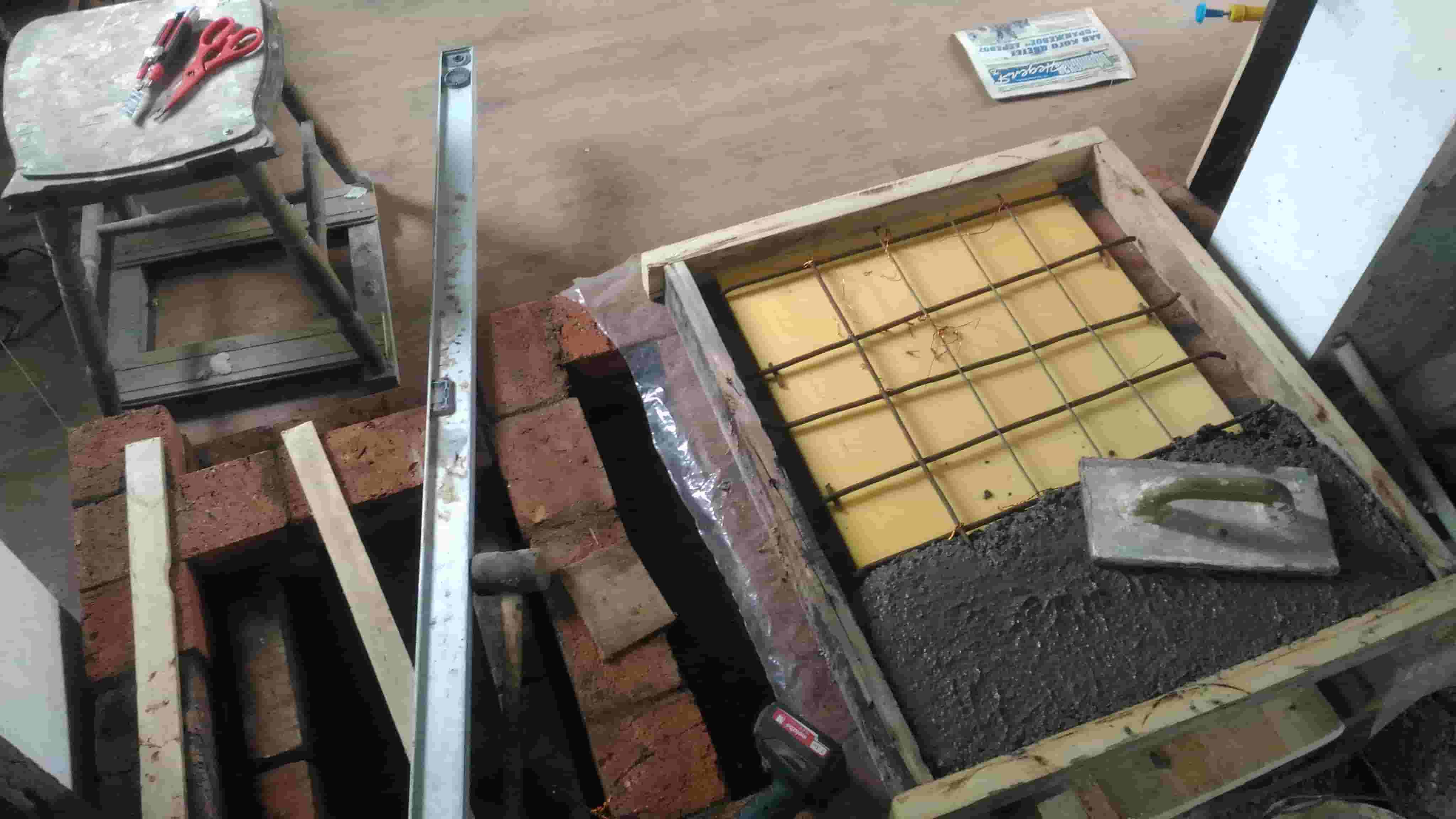 Опалубкой послужили 4 бруска и лист пеноплекса который я потом чикнув ножиком снизу с лёгкостью вынул. В последующем на монолитную плиту будет уложен ряд кирпича который и послужит подом очага.