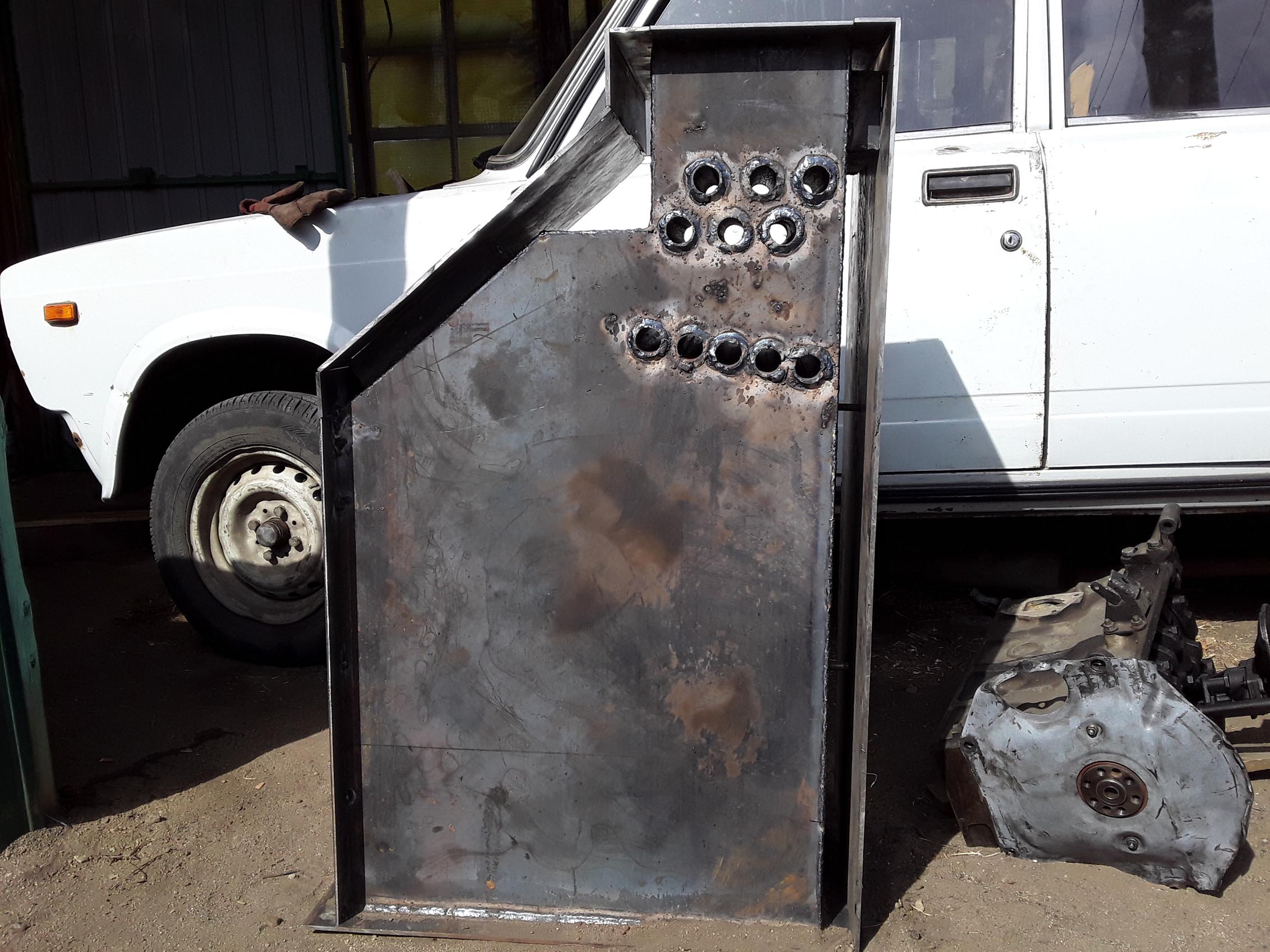 Сверху дверка для доступа прочистки теплообменника (поперечных труб в верней части), дверка чуть ниже под 45 градусов - для загрузки угля.