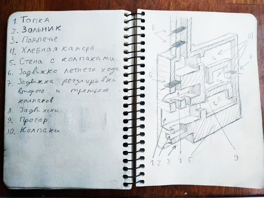 Решил всё таки сделать щиток, для того чтоб была возможность переводить печь в зимний режим, для увеличения кпд печи , чтоб больше тепла оставалось в помещении. В интернете у печей с хлебной камерой (ХК), опускные каналы находятся по бокам , что делает печь широкой , в моем случае нужна узкая печь. Узкая потому что хочу сделать так чтоб печь находилась в нише , и тепло благодаря этой нише шло в большую комнату , на против топки . По бокам печи в нише, получаться две ниши шириной по 30 см. , в них я собираюсь хранить и сушить дрова перед тем как бросить их в топку.
