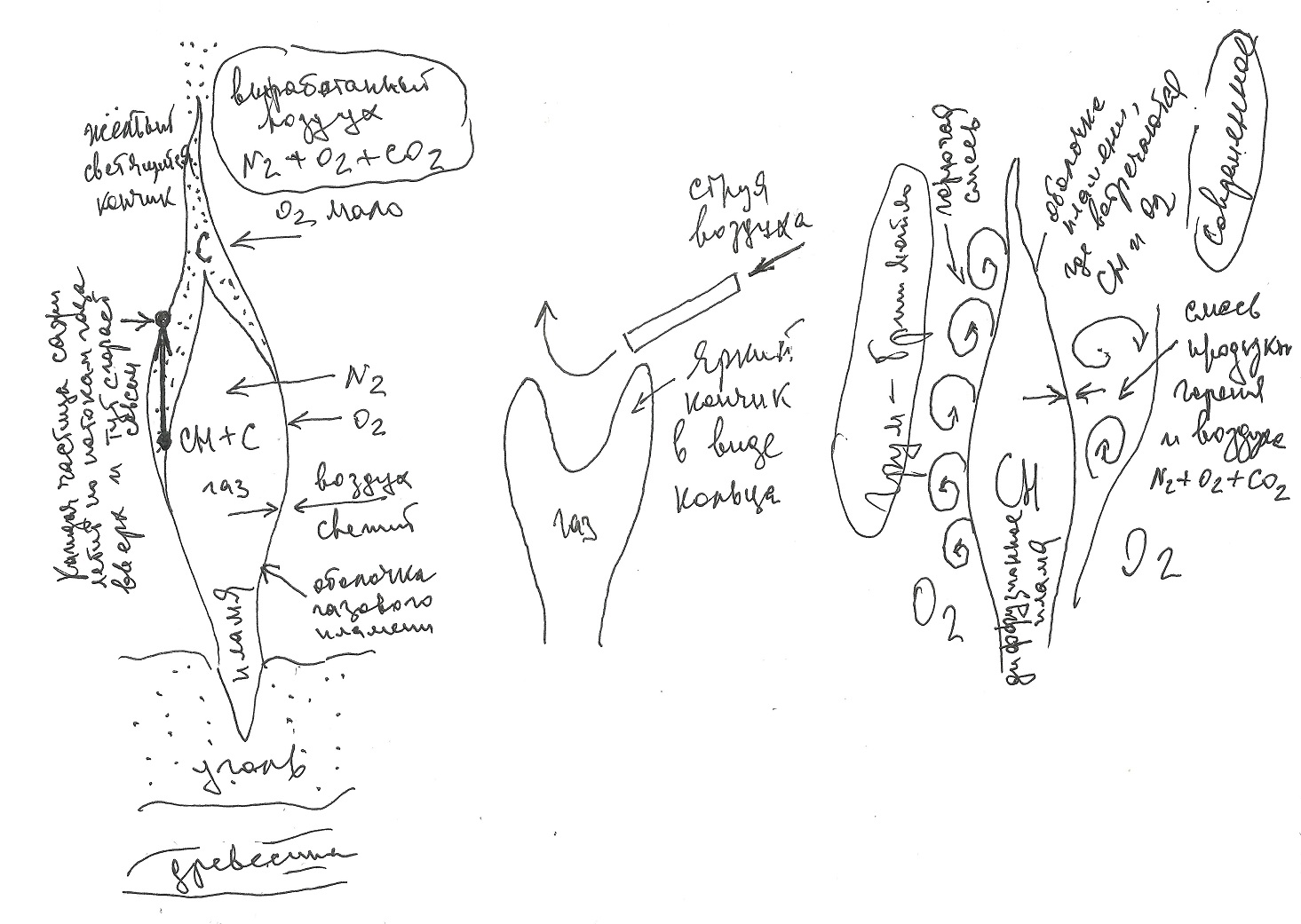 7. В этом плане очень интересны исследования Шевякова с пламенами в узилище (заужении). Например, почему пламя не разгорается при радиальном набегании воздуха. Уже нет углеводородов? Или СО тоже нет? Только сажа? Короче, пламена могут быть разными и ведут себя по-разному. Ну а если в заужении пламен нет, то и ожидать нечего (кроме смешений ПГ с ВВ в керогазах ракетчиков).