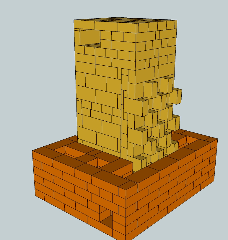 4. Да, висячих много. Но предпоследний ряд висячих кирпичей перевязан с внутренним рядом задней стенки, он должен предотвратить разваливание. На сухую буду проверять. |