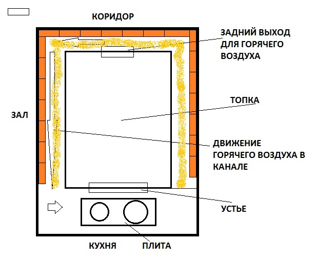 Спасибо! Все-таки была бы благодарна за совет по переделке Поступило предложение от одного из местных печников, чтобы не ломать и не переделывать всю верхнюю печь попробовать такой вариант - открыть верх, убрать железо из под лежанки, убрать глину с битым кирпичом над сводом и засыпать свод и эти боковые каналы песком, также, заложить кирпичом задний выход для горячего воздуха. Попыталась изобразить на рисунке - оранжевым кирпич на ребро, затем утрамбованный песок. Было бы интересно коллективное мнение профессионалов, стоит ли пробовать этот вариант или есть какой-то другой по Вашему мнению? Заранее спасибо!!!!!
