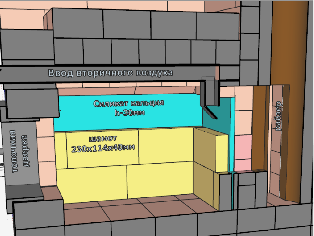 Колпак вокруг райзера футерован силикатом кальция (бока, 30мм) и шамотной лещадкой (над райзером, 230х114х40мм)...