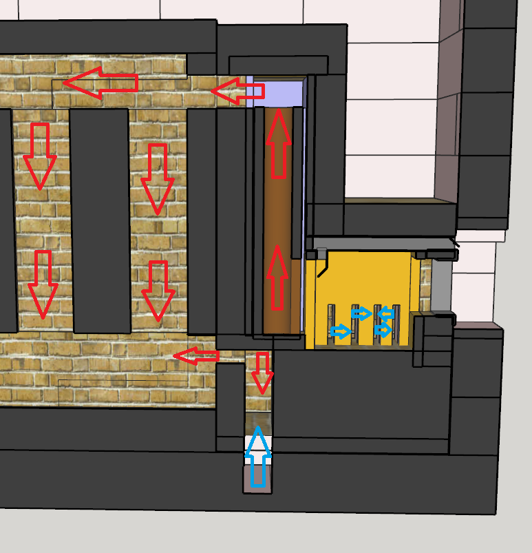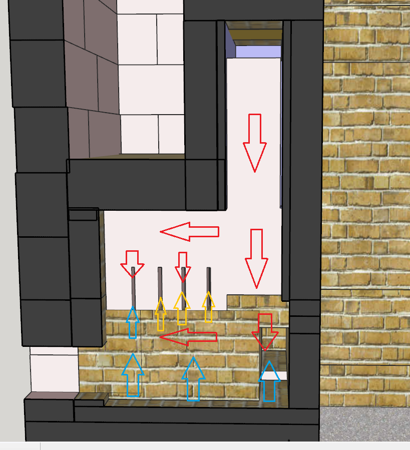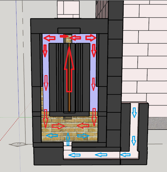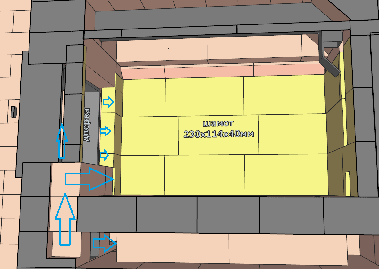 По одному из каналов пойдут горячие газы, нагревая футеровку из СК, по второму пойдет реверсный поток (не одномоментно, но все же довольно скоро), когда мы закроем топочную дверку...