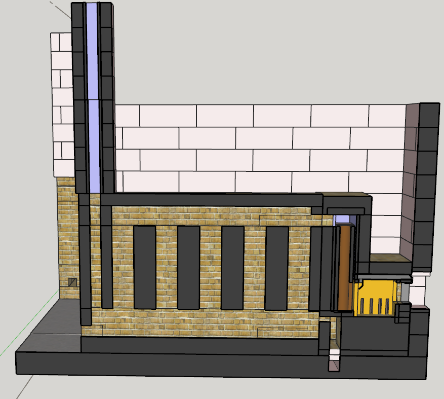3. По достижении температуры в топливнике порядка 400*С полностью перекрываем подачу первичного воздуха (герметично), но приоткрываем (на половинку) заслонку подачи подпольного воздуха, который подогревается в нижнем коллекторе и подаётся в топливник через 3 прогара небольшого сечения (два 130х15мм и один 55х40мм)... Заслонку выставляем таким образом, чтобы поддерживать горячее тление-горение с альфой единица или чуть-чуть меньше... Нам нужен горячий и горящий пирогаз! это газовое тело смешивается в верхней части порта со вторичным воздухом, подогретым в металлическом канале и основное горение перемещается в райзер (вертикальный жаровой канал, имеющий низкую теплоемкость и теплопроводность и высокую огнестойкость)...
