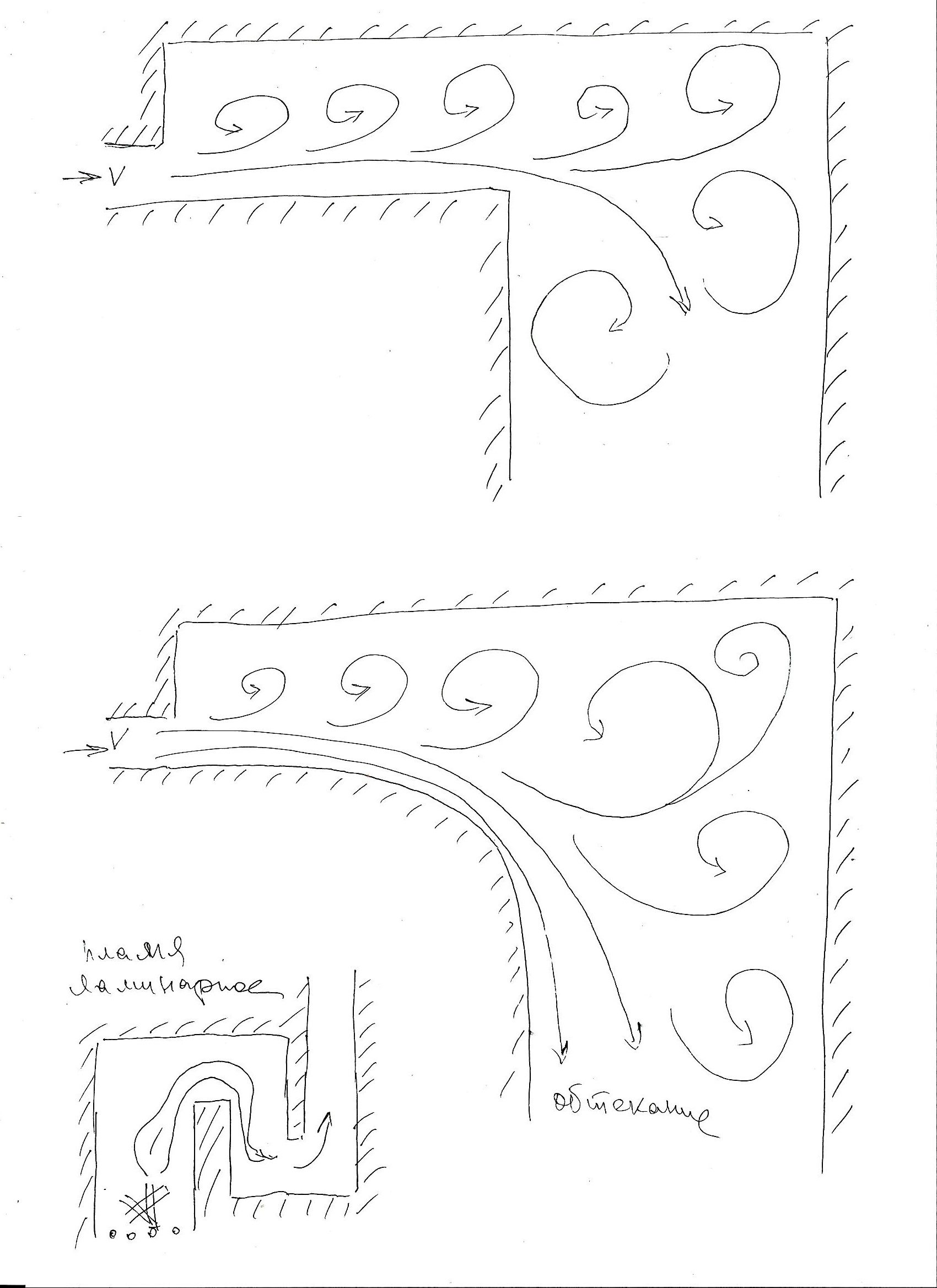 Струя, касаясь стенки, приобретает большую дальнобойность. И способна огибать повороты (обтекать, облизывать, прилипать). Особенно при большой вязкости (кинематическая вязкость воздуха 15 при 20 град и 130 при 800 град).