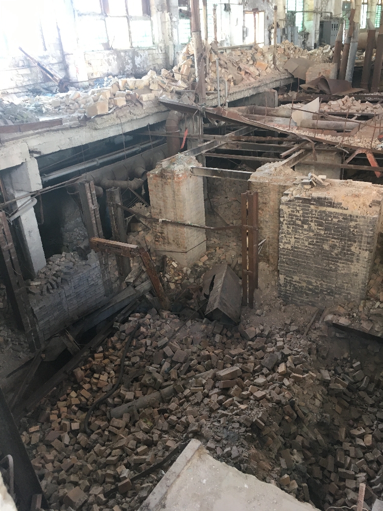 Они очень тяжелые, и лежат именно на развалинах заводской печи. Там никакого фасада нет и не может быть, зато некоторые кирпичи оплавлены с одной стороны, а некоторые покрыты оплавленным стеклом