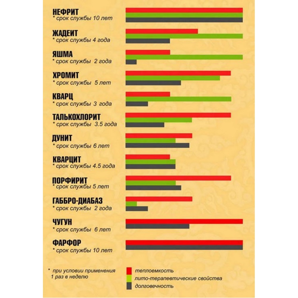 мне кажется эту таблицу делали люди заинтересованные в продажах нефрита. Очень уж "гладкие " и причёсанные показатели. У меня талькомагнезит в периодичках служит 7-10 лет -в зависимости от условий эксплуатации и природного хим.состава.