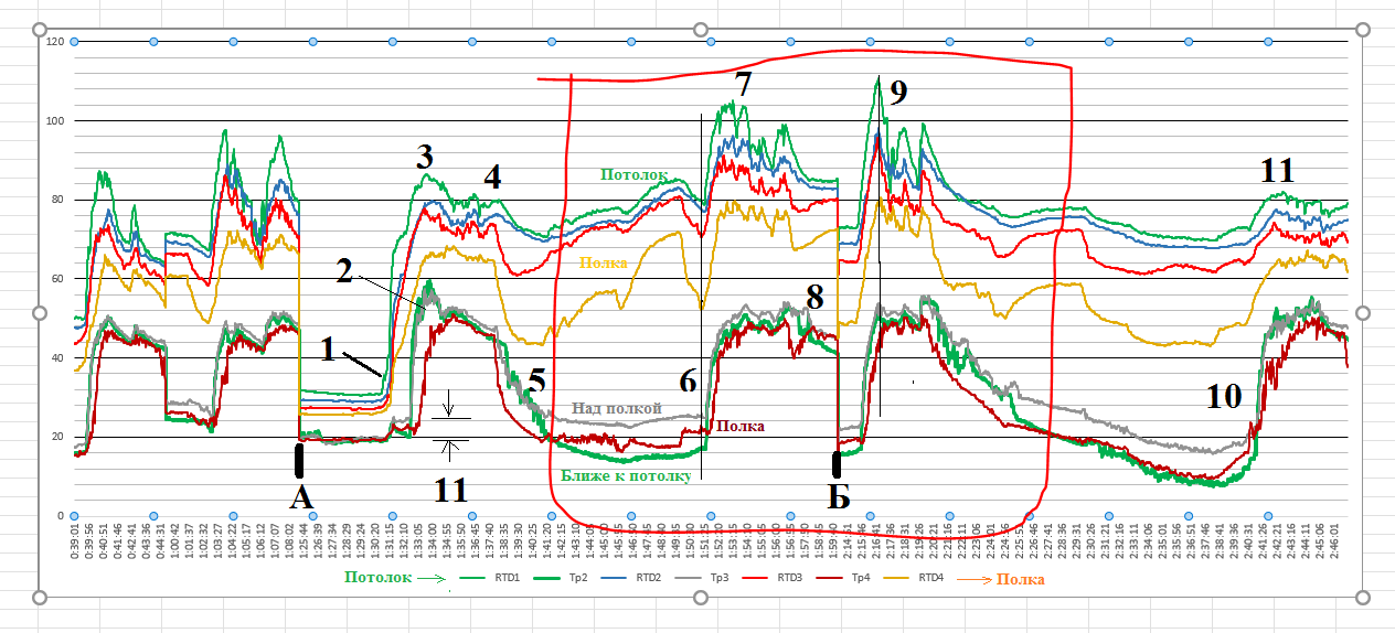 К сожалению, я дальтоник и плохо читаю графики, но попробую дать доп.инфу. А и Б разные дни и Сергей об этом пишет. Баня греется не только каменкой, там еще теплый пол, а еще и ЭК включил для получения плохо перегретого пара. Плюс еще мощное ИК от КП. Парная перед заходом проветривается и Т падает, но после закрытия окна очень быстро восстанавливается. Вообще-то вы задаете столько вопросов, что лучше бы конечно встретиться.