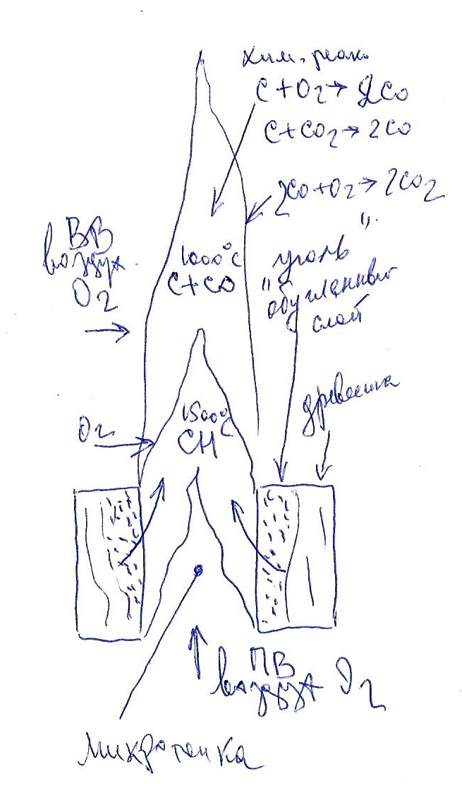 Примерно так же распишите Ваш процесс. Слой угля, через него воздух. Если бы выходил СО2, то температура углей и газов была бы выше 1500. Но у Вас выходит СО - с какой температурой? Этот полугаз СО входит в кучу поленьев, греет их, выделяется столько-то пирогазов СН. Получается новый полугаз СН+СО. Хорошо бы он был холодный, можно было бы смешать с воздухом. Но полугаз горячий, идет струей, горящей с поверхности. Поступает в райзер и т.д.