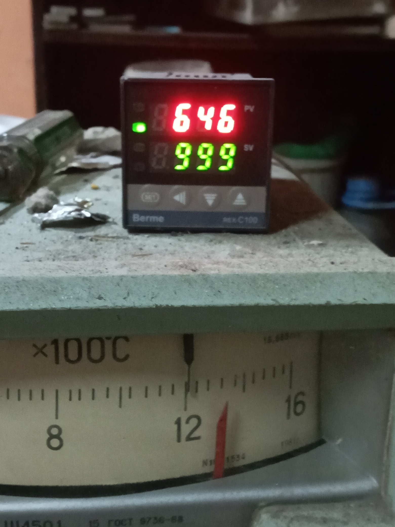 фото с показаниями градусников. Верхний показывает температуру исходящих газов топки - 646 градусов и температуру низа райзера -1210 градусов. Ну с учетом температуры отходящих в 65 градусов, думаю хороший результат.