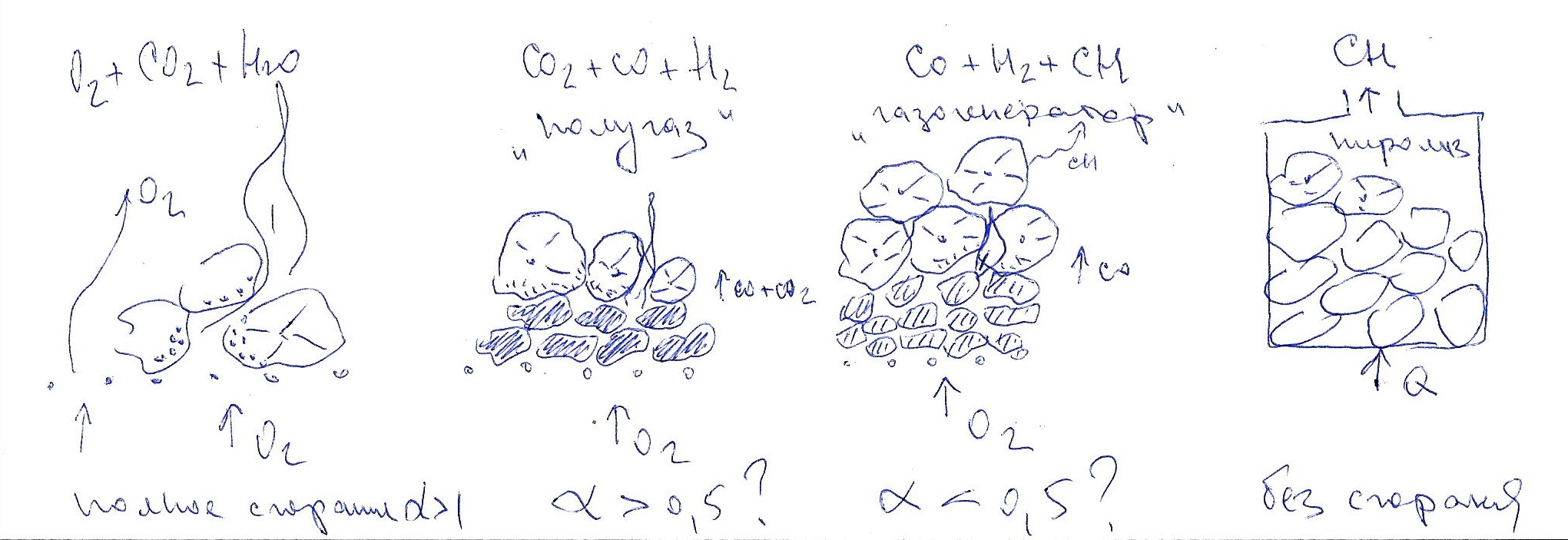 Например. Тонкий слой углей высокотемпературный, выпускает СО2 и О2, частично сжигает пиролизные газы от дров (полугаз). Толстый слой углей более низкотемпературный, выпускает СО, пиролизные газы не сжигает (газогенератор прямого действия).