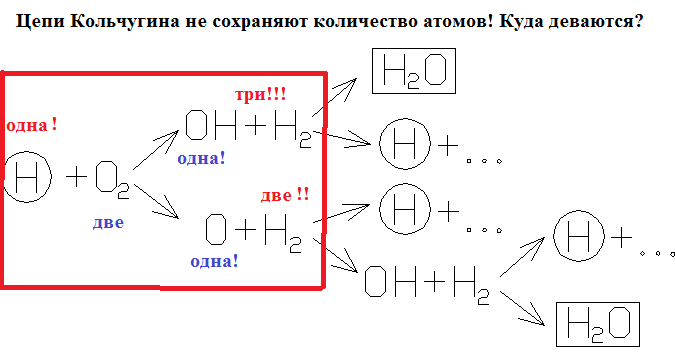 Если Вы и слышать не хотите об обратных реакциях, то хотя бы объясните, почему Ваша "зарождающая" реакция О2+Н (по измерениям) фактически запрещена высоким барьером Е=70кДж/моль! А Ваша головная реакция Н2О =ОН+Н не только фактически тоже запрещена, но к тому же требует активации третьей частицей М*... И Ваша последняя (уточненная?) схема цепи, когда из одного атома водорода вдруг появляется сразу три(!), тоже требует пояснений.