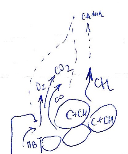 Продувочный воздух работает в горелке не с изначально бурым углем, а с полукоксом, из которого термолизом выдавлена основная доля, летучих (которых 47-49% в зависимости от типа угля), в основном метан... А дальше мы и работаем в основном с угарным газом в который трансформируется углерод, соединяясь с кислородом воздуха в условиях высоких температур... Что можно наблюдать в те моменты времени, когда горелка работает в режиме снижения мощности...
