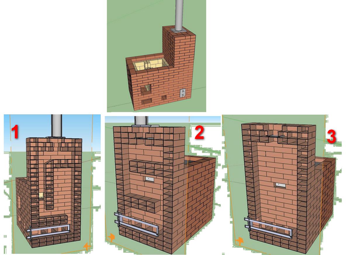 Подскажите, если не трудно, как лучше организовать колпак в такой печи? На рисунке изобразил три варианта, какой лучше сделать, может подскажите ещё какие-то?