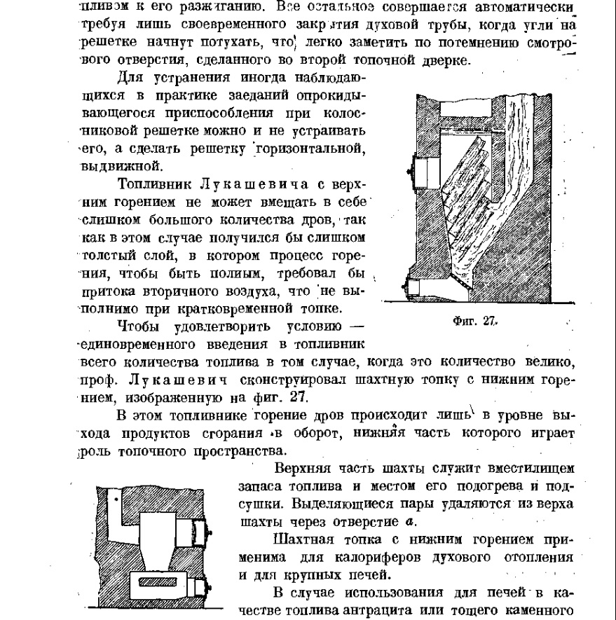 | Если посмотреть альбом Шетак-Устинова за 1913 год, то большинство комнатных отопительных печей имеют топливник Лукашевича с верхним горением.Подовые топки были отброшены из класса отопительных печей, как не соответствующие современным реалиям. |