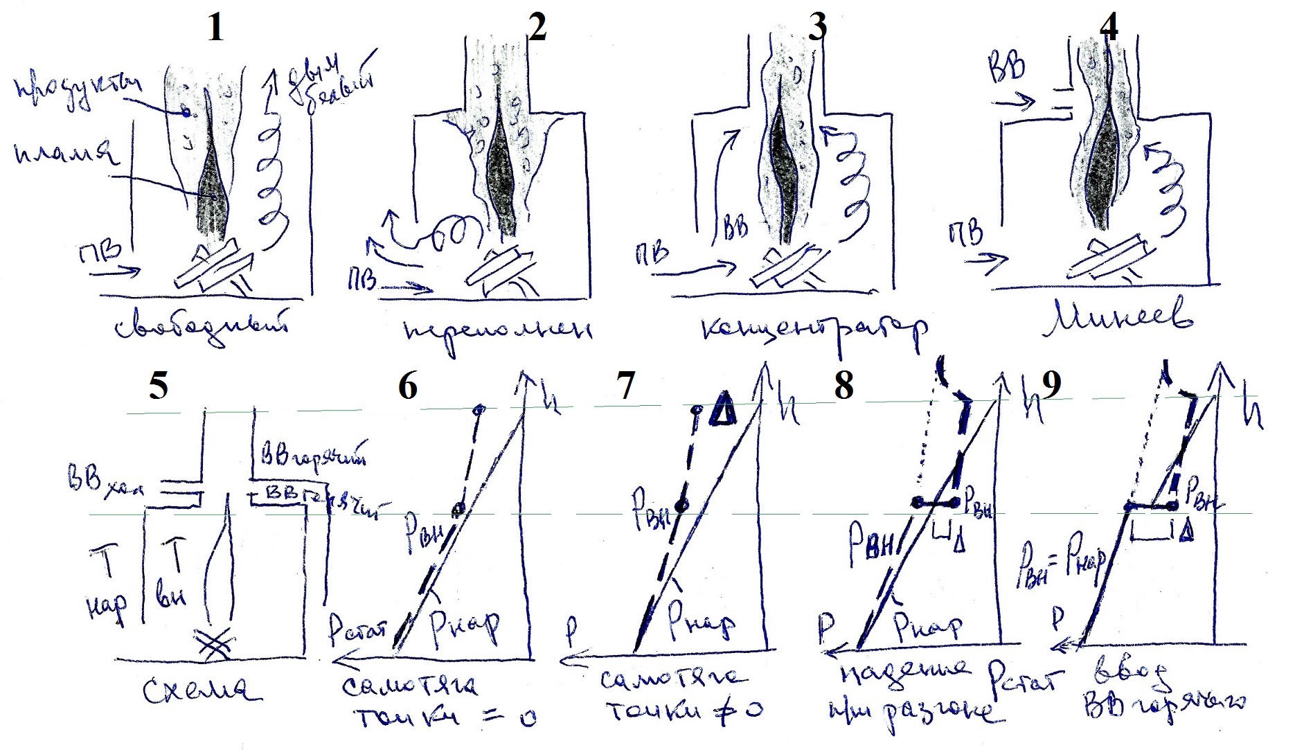 3. Практически значимые режимы находятся в промежутке между 1 и 2 (пламя целиком залезает в дымоотвод с одновременным подсосом ВВ и дыма). Пламена начинают обдуваться радиальным потоком ВВ, а продукты пиролиза входят в контакт с пламенами. Дымоотвод превращается в концентратор (порт). Если пламя не залезает в дымоотвод, то фактически имеем случай 1.