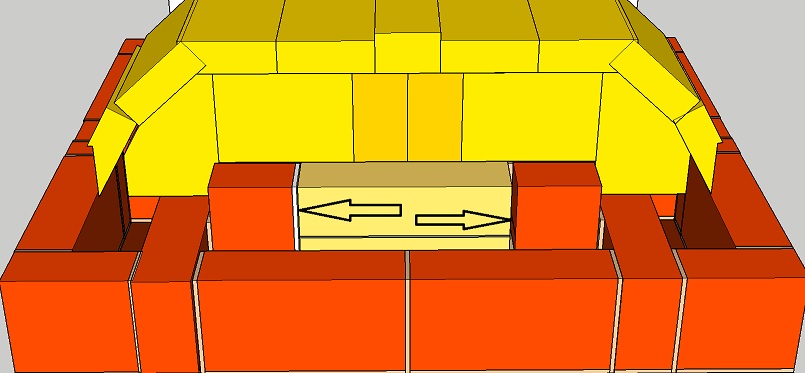 Да .. размер порта (хайла) именно такой. Он сделан узким для того чтобы собрать все струи газов в наиболее теплонапряженном месте пламенной зоны. Перекрытие рализовано из трех кирпичей с вырезом под порт , которые просто лежат в распор на тонкой футеровке и задней стенке. Их даже можно пошевелить рукой.. они лежат без нагрузки. |