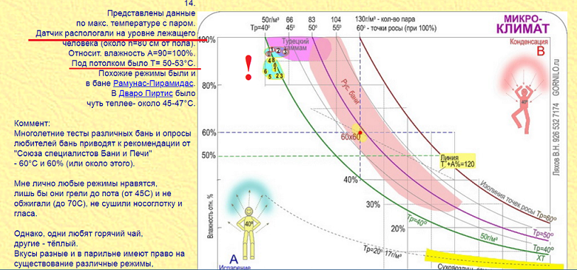 Во-вторых, если бы все тут же перемешивали бы, то консенсуса было бы больше. Но все смешивают как придется. Кто простынью, кто веником, кто струйной залповой подачей, а кто и совсем не перемешивает и дает облаку пара из каменки всплыть под потолок. При этом любой контакт пара, любое охлаждение или осушение меняет всю картину. И эта картина прослеживается на М-Т диаграммах. То есть к своей интуиции и к своим глазам-рукам добавляем элементы арифметики для оценки возможности достижения целевого режима (как при подсчете купюр в кошельке, чтобы выяснить, действительно ли хватит ли денег на конкретную покупку).