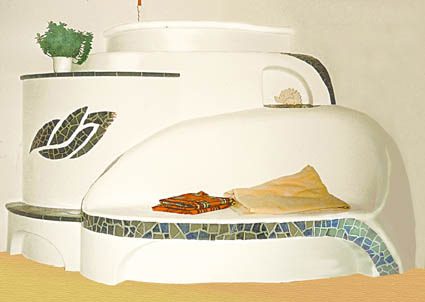 На фотографии Ofen-94.jpg используется каминная чугунная вставка, над которой вверху есть выходные отверстия для тёплого воздуха. Сидение в этом камине не может быть тёплым, хотя лучистое тепло от чугунной топки внутри этой конструкции всё же распространяется, но за разумное время такую массу кирпича оно не в состоянии нагреть хотя бы до температуры +30°С при комнатной температуре +22°С.