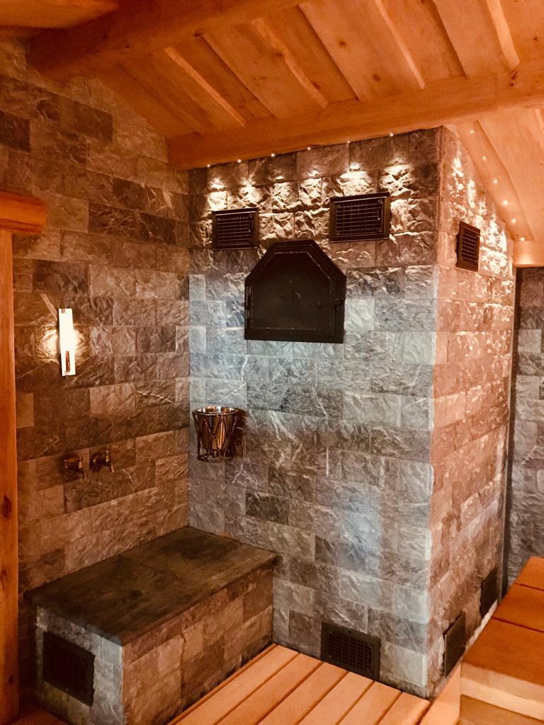 Банная печь Теклар "эребус" , в двухконтурной облицовке отделанной натуральным камнем.