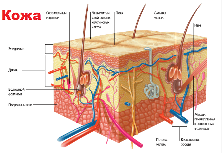 Микрокапилляры, нервы, волосы, потовые железы - всё это расположено в дерме.