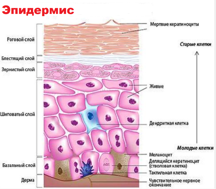 А дерма защищена эпидермисом, где из стволовых клеток постоянно рождаются, состариваются и умирают защитные клетки.