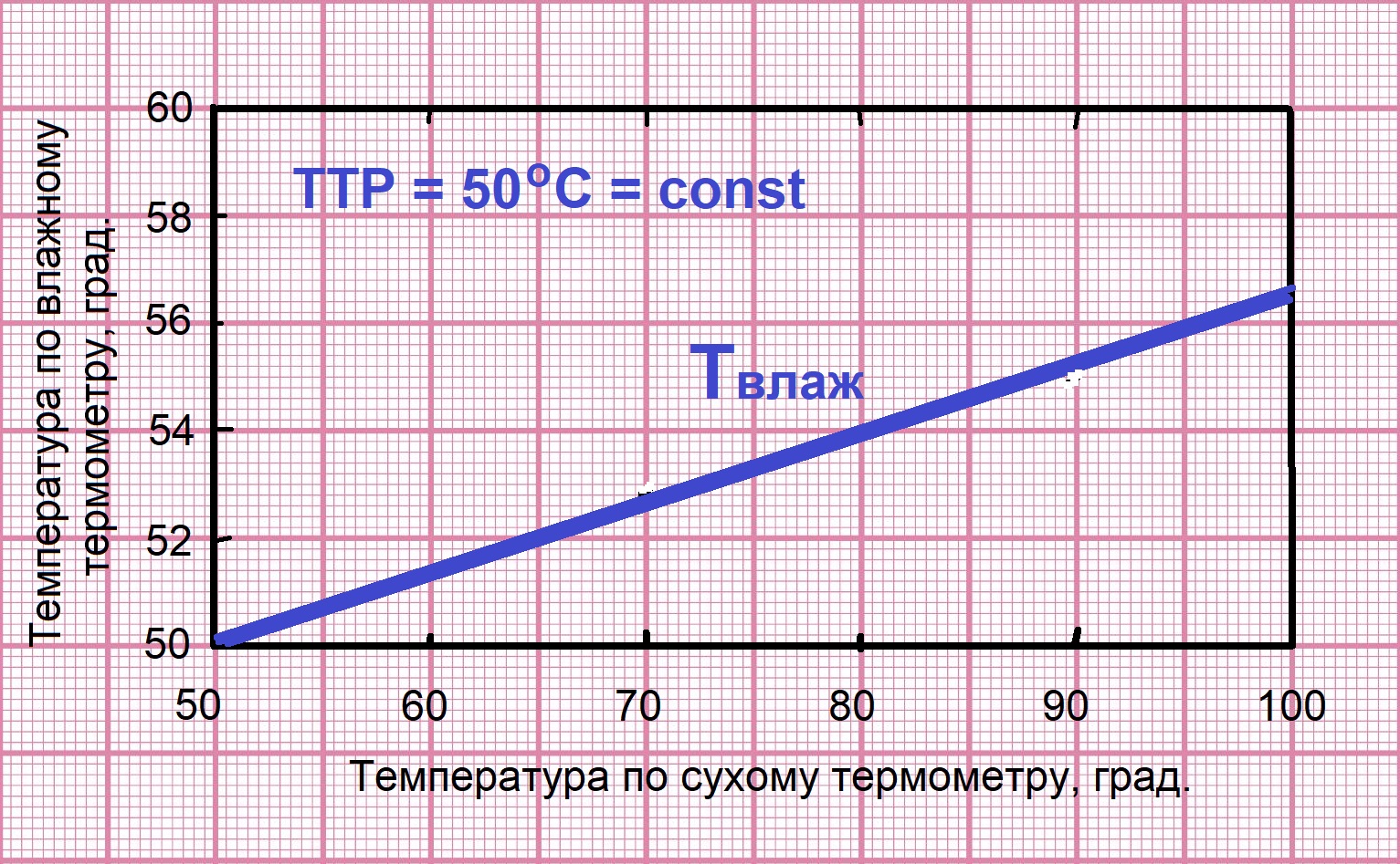 Так, если при Т50/ТТР50 кожа не может нагреться выше Ткожи50, то при Т100/ТТР50 влажная кожа может нагреться до 56, а сухая до 100. И конденсации не будет. Это иллюстрирует зависимость температуры по влажному термометру Твлаж от Т (см. вложение).