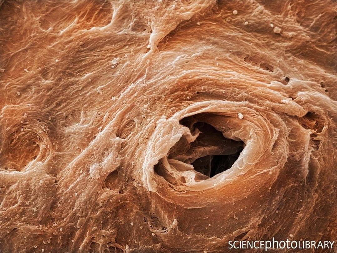 Вот нашел интересную микрофотографию кожи человека с потовой порой (устьем протоки потовой железы).