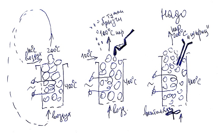 Если в такую открытую каменку полить из ковшика, то верхние камни тотчас остывают, поток воздуха охлаждается до Т100, вода кипит в пузырьком режиме с брызгами и даже с появлением тумана (клубов пара). При испарении брызг воздух остывает еще больше, причем воздух увлажняется порой до насыщения Н100 (например, Т70/ТТР70). Немного может спасать горячий воздух из глубины камней Т400, но если потока воздуха в каменке нет (режим русской бани), то все это поднимается вверх, образуя жгучий пирог.