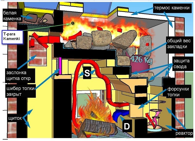 Нагрузка 350 кг чугунокамней + 300 кг шамотной плиты - свод. Поскольку каменка расположена НАД топкой, то её дно (он же свод топки) служит активным элементом парообразования и очень весомо добавляет тепла в общую копилку. Каменка уложена набок, над Реактором находится горячая часть её, а Т-пара установлена на противоположном - "холодном" конце, ближе к хайлу. Разница по Т между концами до 250С (измерялось пирометром через верхнюю крышку Каменки).