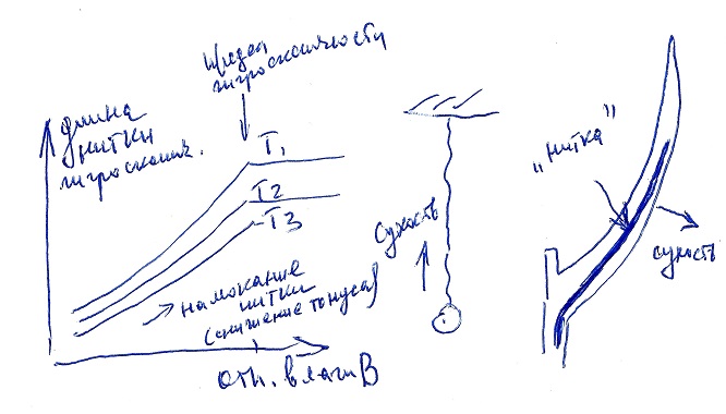 "Прикинув" относительную влажность В (хотя бы по длине нити в бытовом гигрометре), прибор умножает В на абсолютную влажность насыщенного пара и получает расчетную абсолютную влажность. Потом возвращается к кривой насыщенного пара и считывает Тр.