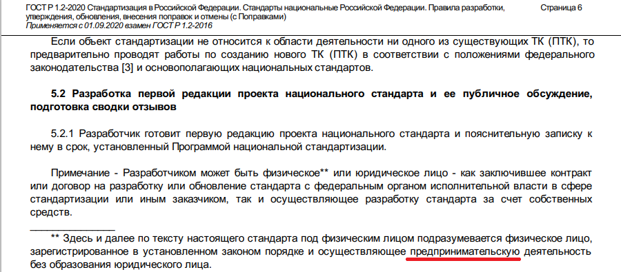 По ГОСТ Р 1.2-2020 - разработчиком может быть физическое или юридическое лицо - как заключившее контракт или договор на разработку или обновление стандарта с федеральным органом исполнительной власти в сфере стандартизации или иным заказчиком, так и осуществляющее разработку стандарта за счет собственных средств. (Под физическим лицом подразумевается физическое лицо, зарегистрированное в установленном законом порядке и осуществляющее предпринимательскую деятельность без образования юридического лица).