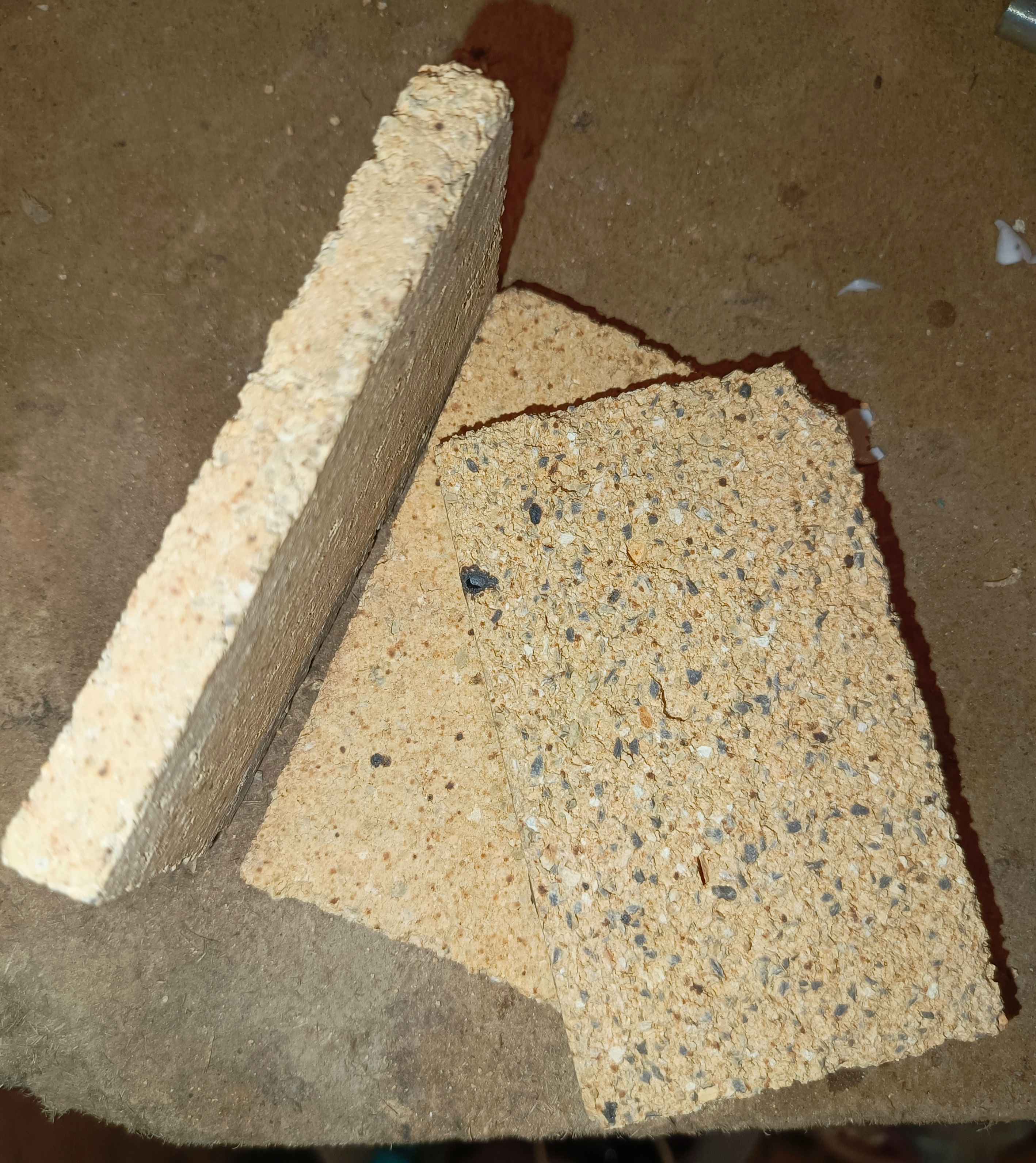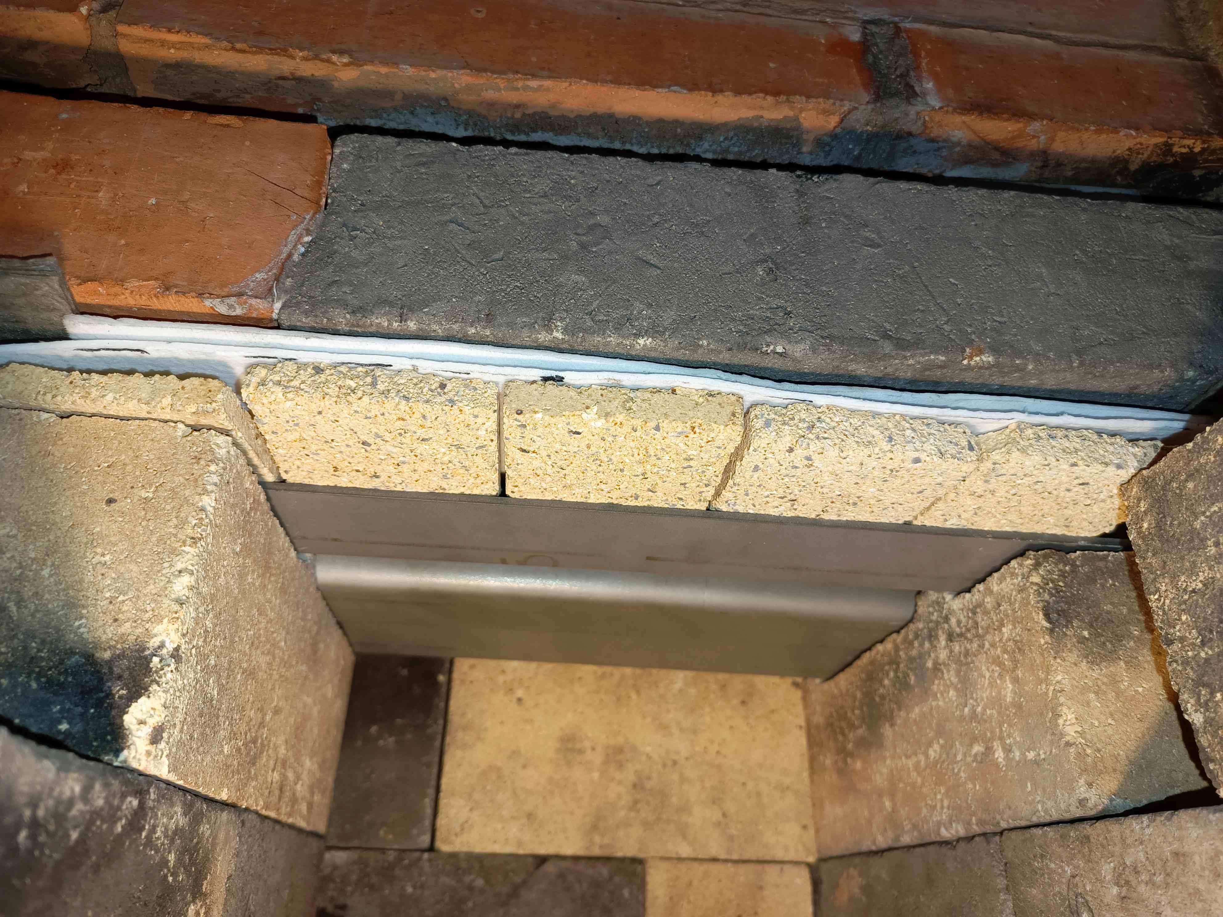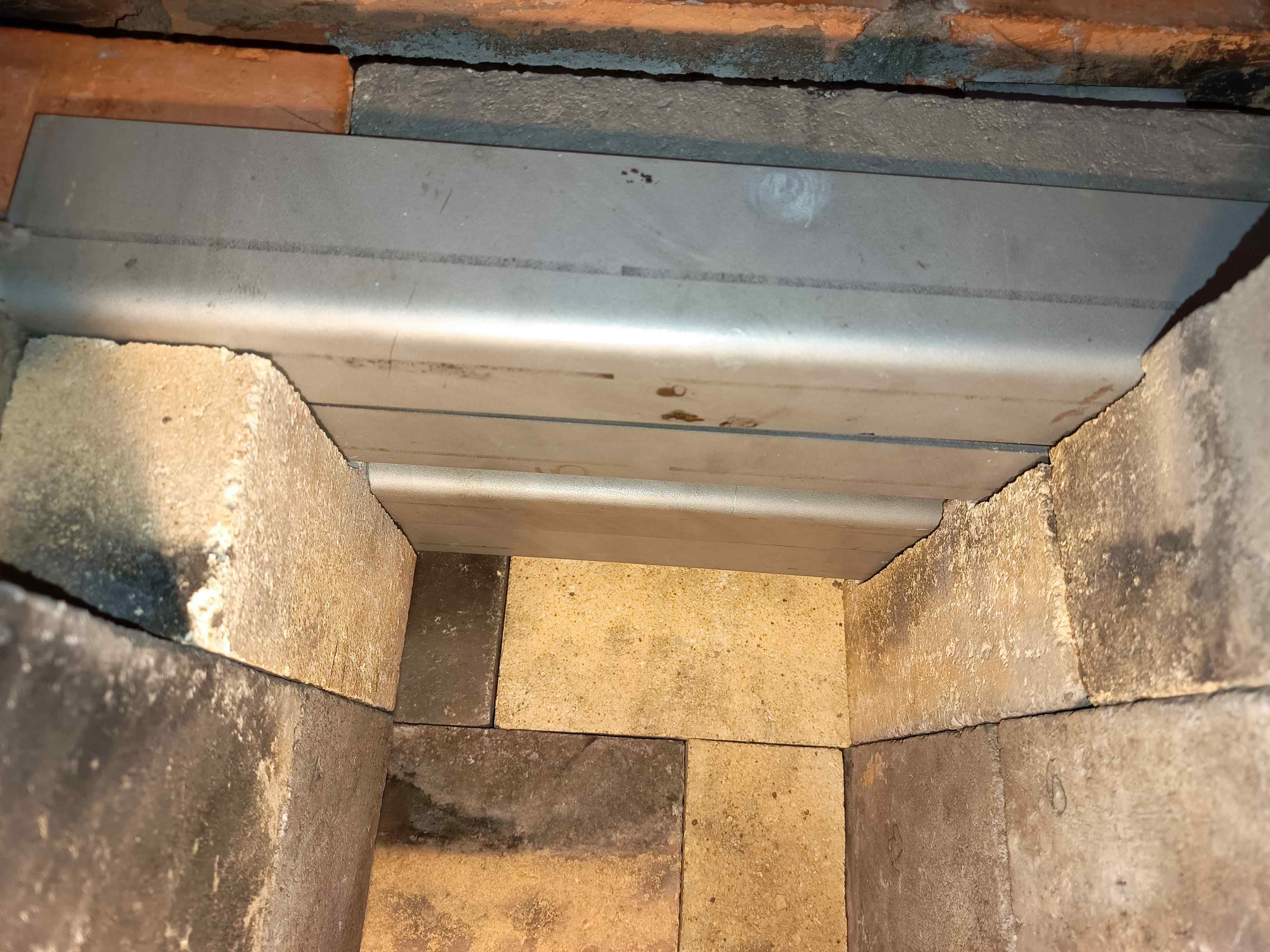 Подточил шамотные кирпичи верхнего ряда,чтоб уголки со своим содержимым имели зазор по вертикали с ранее установленными кирпичами перекрытия и не болтались по горизонтали. В итоге вот что получилось.
