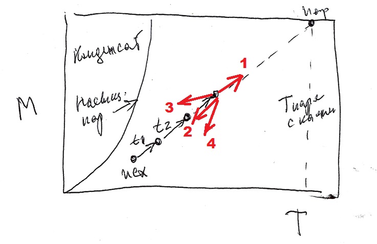 Вообще говоря, при поддаче исходная метеоточка должна ползти к метеоточке пара их каменки. У Вас всё уложится в интервал времени t1. Если дольше подавать, то добавиться t2. Ну а потом не известно - то ли пойдет дальше по стрелке 1, то ли назад 2, то ли охлаждаться на стенах 3, то ли осушаться 4... |