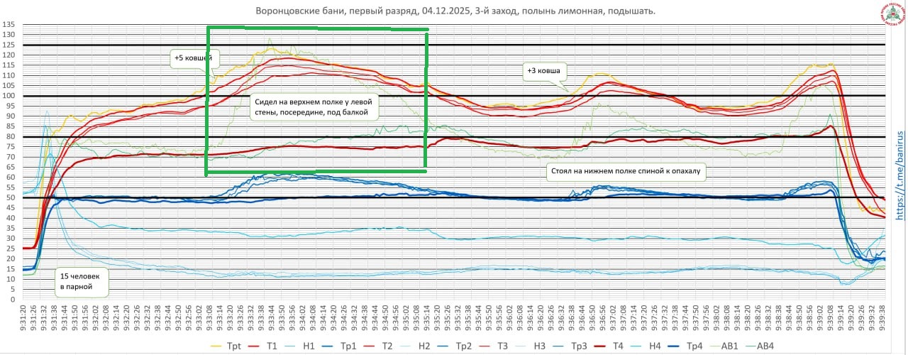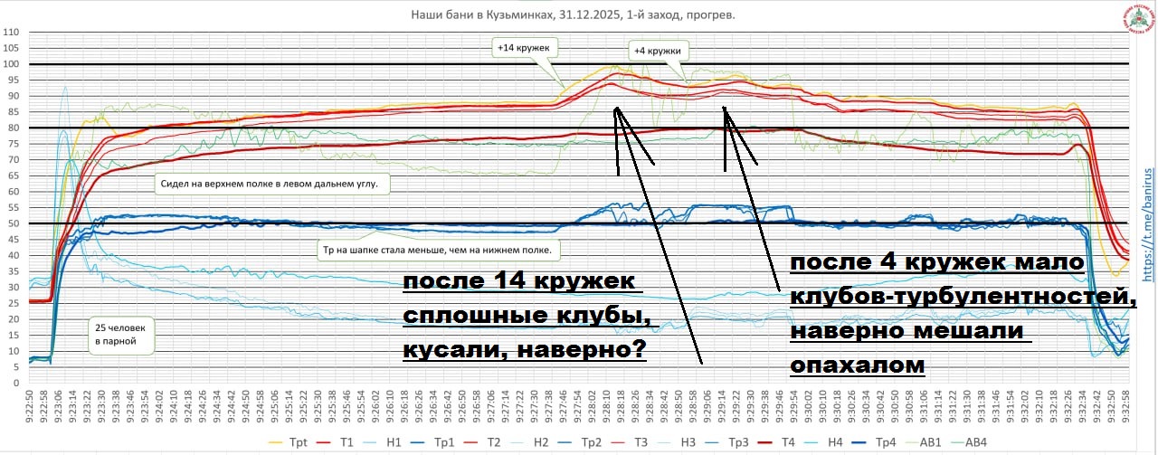 Датчик на шапке не один, а целых три. Плюс Pt100A для подстраховки. Если капля от веника на один из датчиков попадает, то сразу видно, как он выбивается из общей картины. В частности для этого их несколько. До начала захода обычно все в одну линию по каждому из трех параметров выстраиваются и после захода возвращаются.