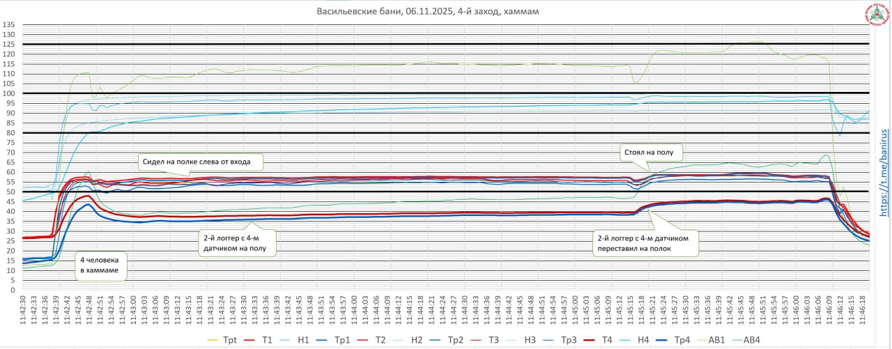 Сидел справа от лестницы, в торце, у стены печи, посередине. 3-й датчик примерно в 40 см. от стены печи. Температура стены печи 125-130С. В конце для проверки влияния ИК излучения от стены печи встал, повернулся лицом к стене печи и так простоял какое-то время. Когда встал, второй логгер с 4-м датчиком переставил с пола на полок.