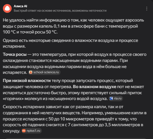 Как ощущает человек аэрозоль воды с размером капель 0,1 мм в атмосфере бани с температурой 100 градусов и точкой росы 50 градусов? Как быстро испаряется такая аэрозоль?
