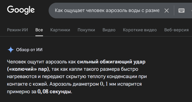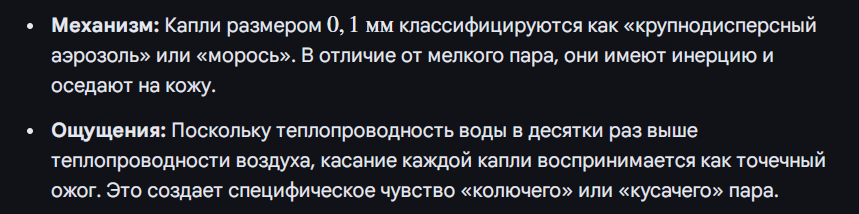 Аэрозоль с размером капель 0,01 мм (10 мкм) при температуре воздуха 60 °C и точке росы 50 °C ощущается как «мягкий» или «бархатистый» теплый пар, который не обжигает кожу мгновенно, но создает интенсивное чувство влажного тепла. Такая капля испарится примерно за 0,02–0,05 секунды, превращаясь в невидимый пар еще до того, как осядет на поверхности под действием гравитации.