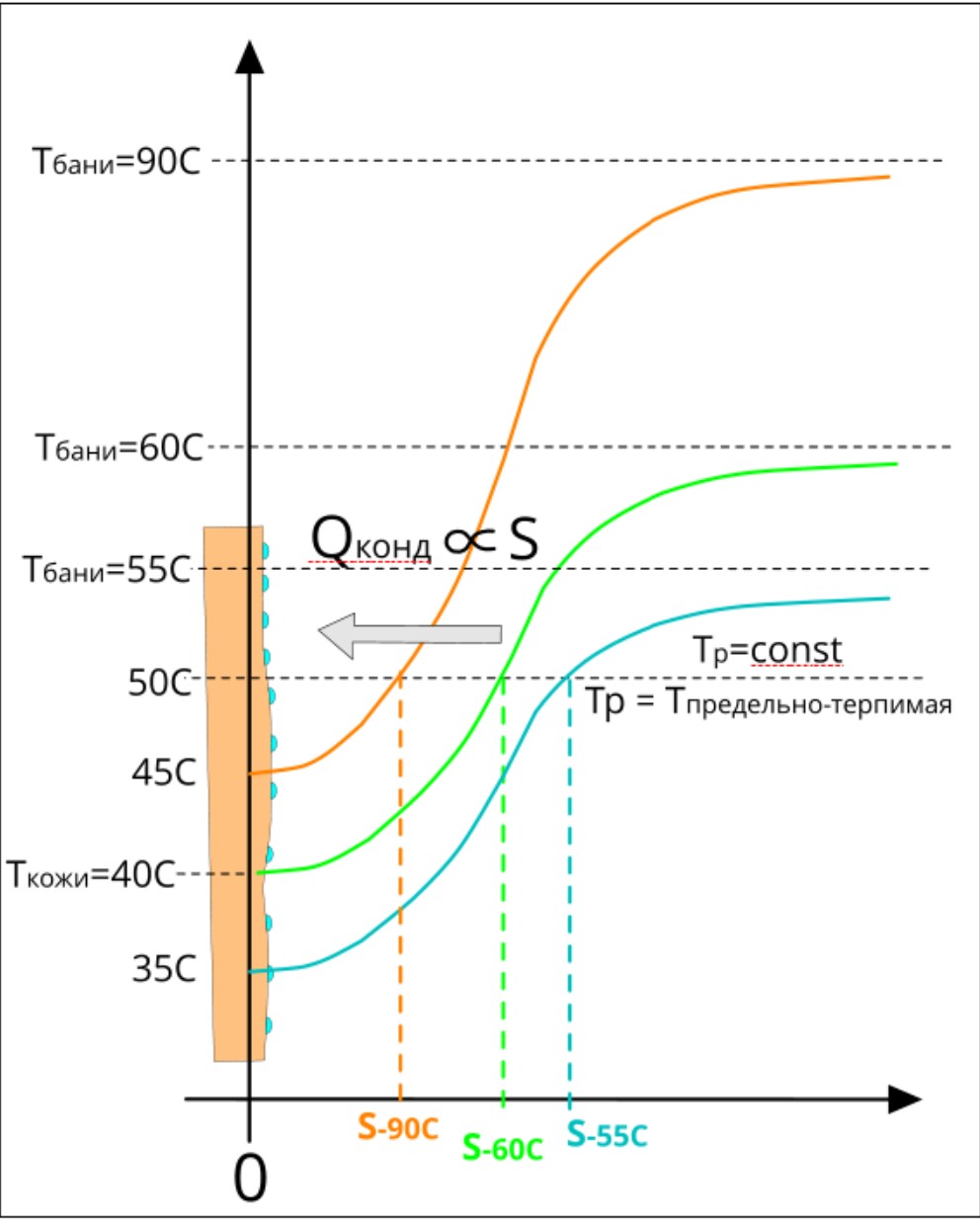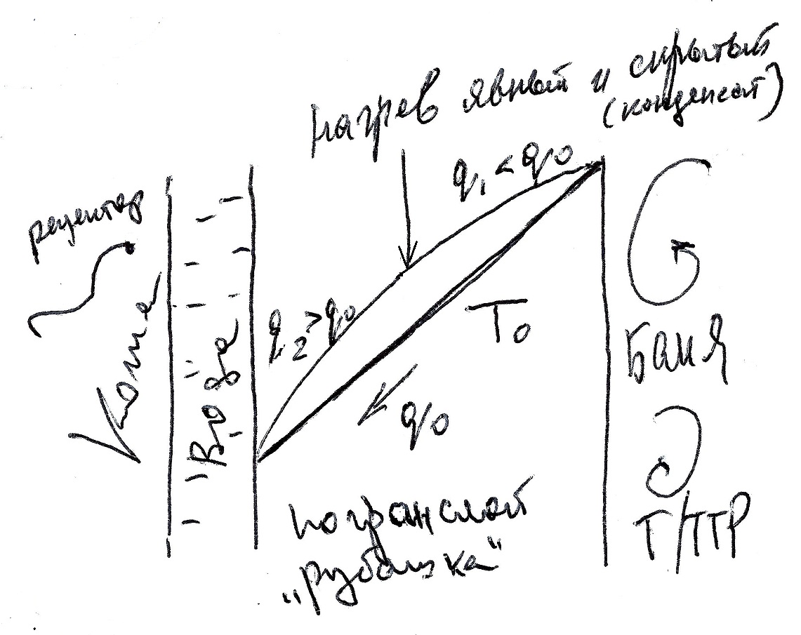 На рисунке ниже я отобразил частный случай конденсационного теплового потока при условии Тр=const = предельно-терпимой Т на коже, при разных Тбани. То есть при разной дельте Захарыча.