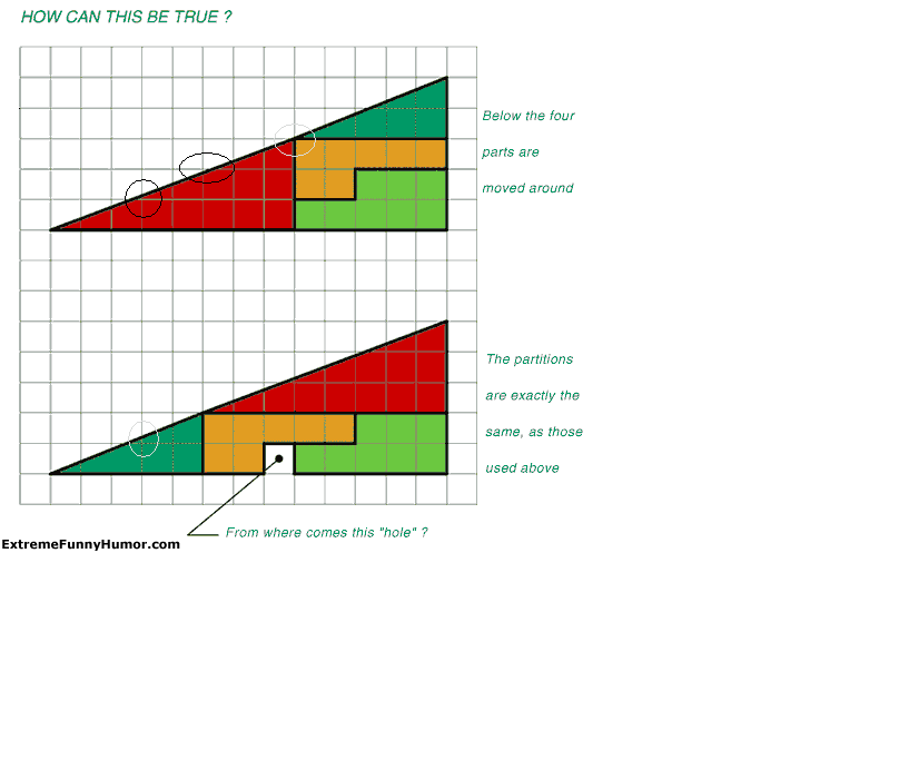 Нижний треугольник содержит ровно такие же части, как и верхний. Оба треугольника равны по площади. Откуда взялась эта дырка?
