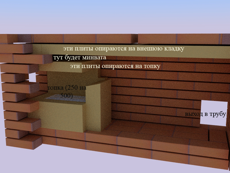 И маленькая фишка. Если дымоход в лежанке проходит в горизонтальной плоскости туда - сюда, и имеет высоту, например 3 - 4 ряда, то первый ряд стенки между каналом туда и каналом сюда, хорошо выкладывать с растоянием между кирпичами в три, примерно, сантиметра. Получившиеся щели в первом ряду перегородки отчасти обеспечивают СДГ, и отчасти же выравнивают температуру на протяжении канала в лежанке.