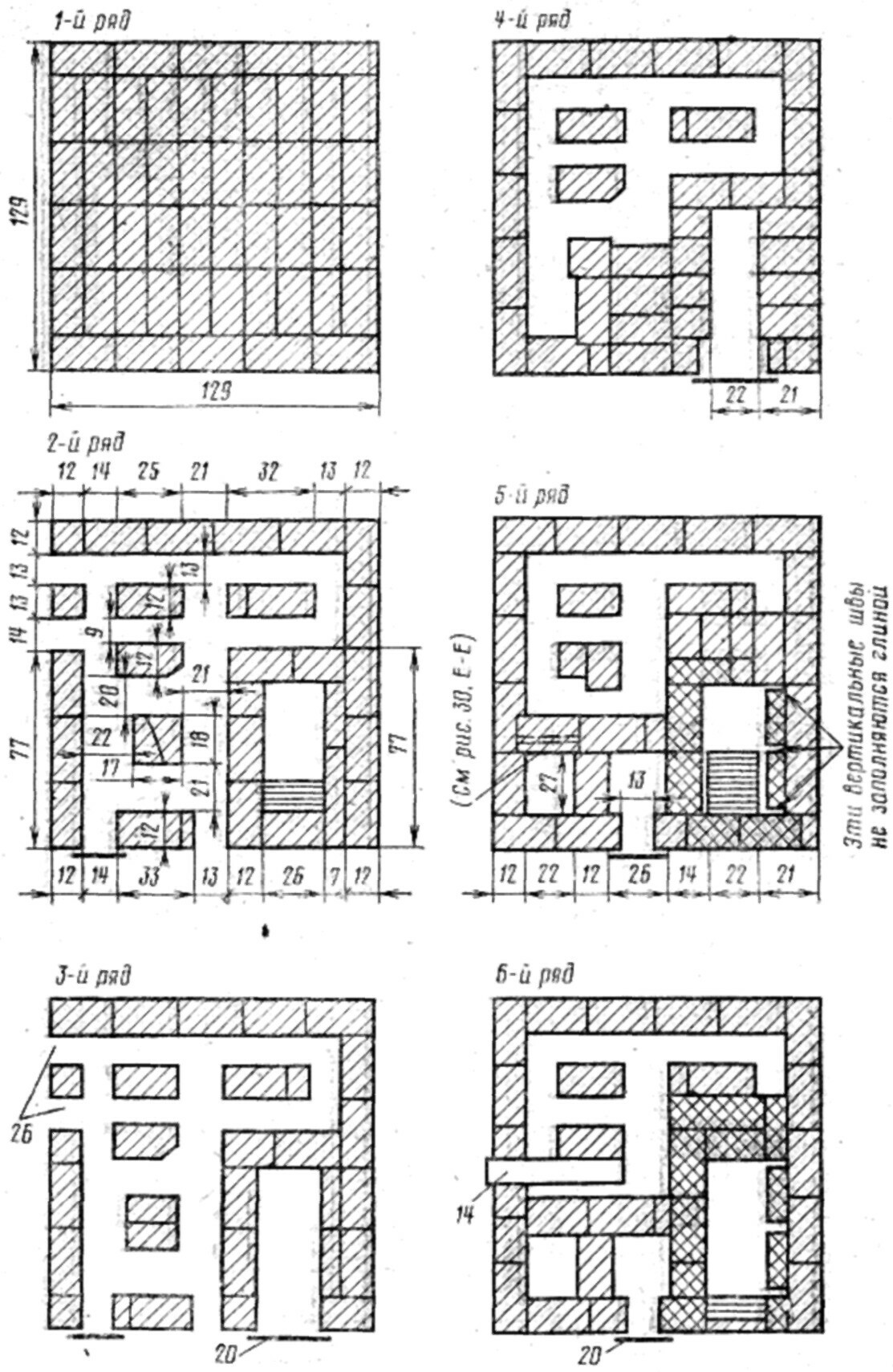 В кладках печей Подгородникова в одном ряду выкладывается огнеупорный и красный кирпич.