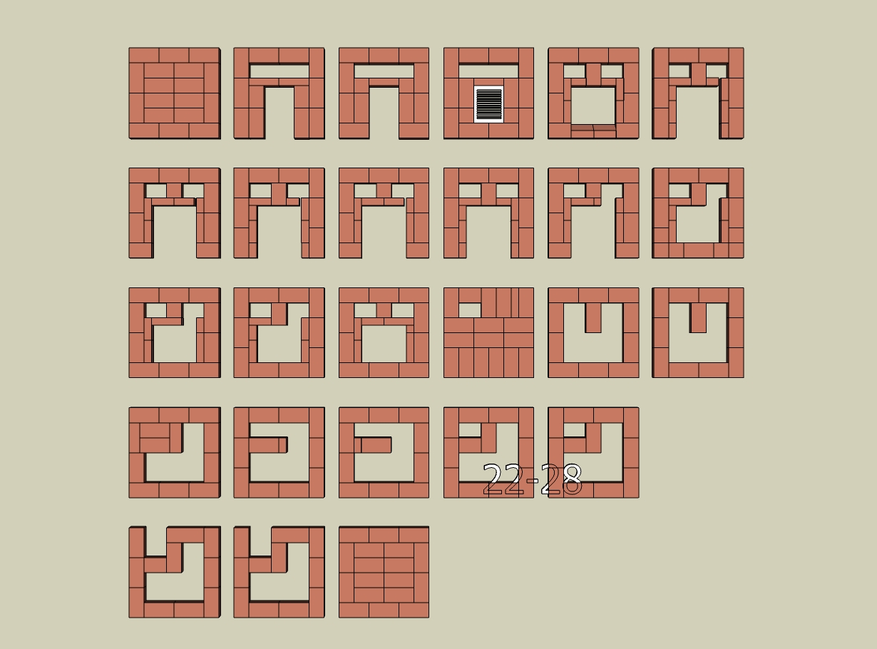 3. Перекрытие колпака не должно лежать на шамотной топке, то есть, перекрытие топки и перекрытие колпака - две разных, не связанных конструкции. То есть перекрытие колпака нужно делать или по уголкам, или перекрыв топку шамотом выстраивать над ней перекрытие опирающееся на стены. Кстати, что в 17 ряду делает красный кирпич внутри? В принципе, перекрытие первого колпака можно выполнить полностью из шамота, и пусть оно гуляет внутри печи, но тогда трубу нельзя опирать на перекрытие.