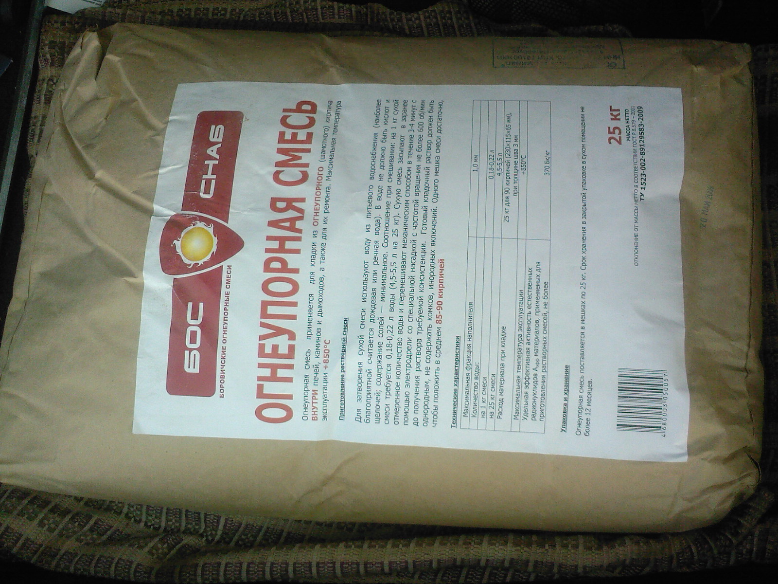 Смесь на основе глины с Боровичевского завода. Фасуют местные компании и ИП в пригороде. Примерно по составу как и смеси СЭВ (даже раскрас мешка чем то напоминает). Смесь достаточно хорошего качества. Для огнеупорной кладки пойдет, главное как песок насеяли чтоб без камней, что часто бывает.