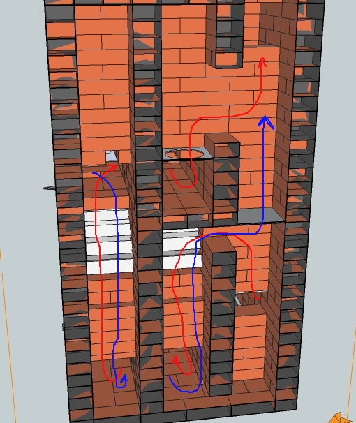 Мне самому не понятно, как дымовые газы уходят из горнила, там показана задвижка вверху свода.Она же будет обгорать постоянно??? И самое главное, дым должен уходить из горнила внизу на боковой стенке, под сводом; но не на нём и притом в самом горниле а не в перетрубье. На схемах же боковые каналы изолированы от основной топки!!!