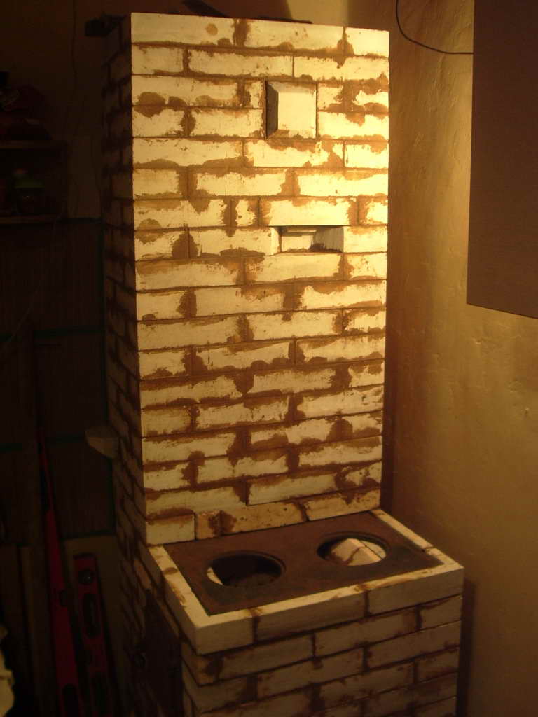 | Футеровка хорошо видна на второй и третьей фотографиях. Кирпич на ребро с трёх сторон + столбик огнеупора под шитком. На столбике асбестовый лист. Ряд огнеупора по периметру колосника и ряд под плитой резаный под углом. |